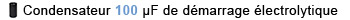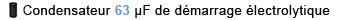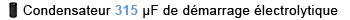 Le condensateur de démarrage quant à lui, assure le démarrage du moteur mais se coupe après le démarrage. Il fournit un couple de démarrage important pour démarrer le moteur monophasé et se coupe quand celui-ci est lancé. Le condensateur de démarrage ne doit pas être alimenter de façon permanente sous risque d'exploser !