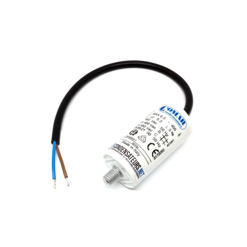 Condensateur permanent 6,3µF (6,3mF ou 6,3 microfarads) 450V pour démarrage moteur électrique monophasé.